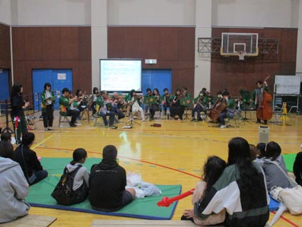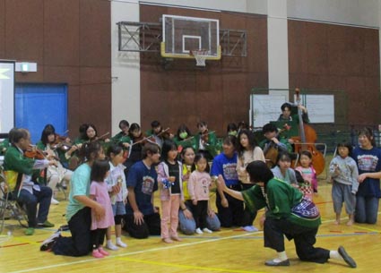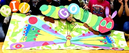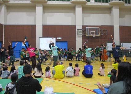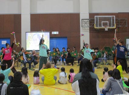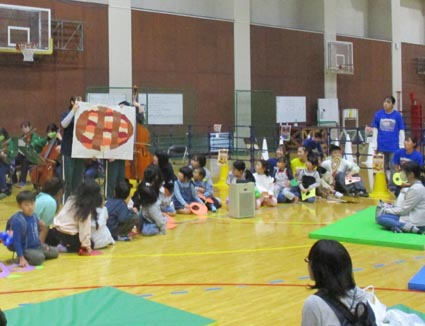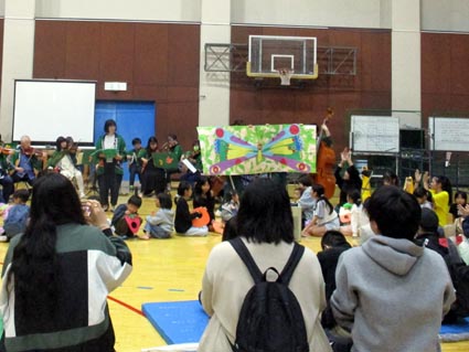 | 仙台大学子ども運動教育学科の皆さんはMCで盛り上げてくださいました。 子ども運動教育学科の皆さんが作ってくださった「はらぺこあおむし」のジャンボペープサートとには子どもたちも参加してもらい,みんなで楽しみました。「子犬のビンゴ」もいつものゲッゲロコンサート以上の盛り上がりでした。 |