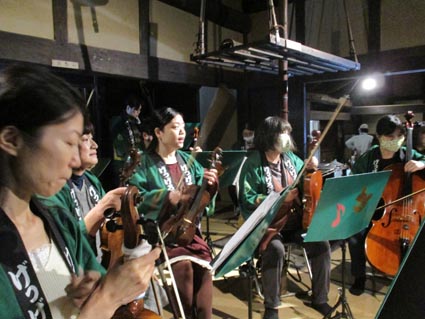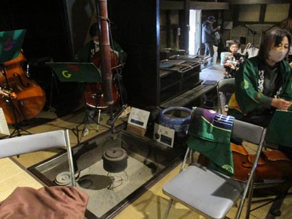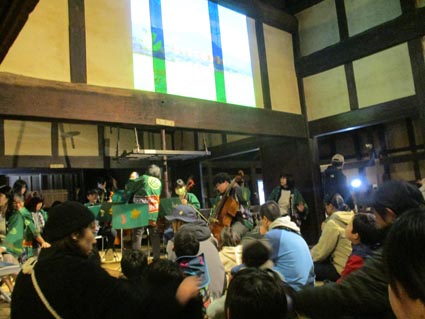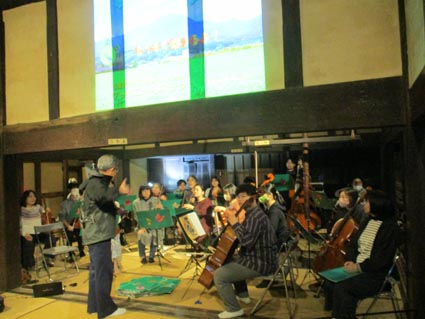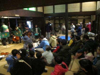 | 旧熊谷家住宅の囲炉裏の周りで演奏です。鴨居の上の小壁がスクリーン代わり。お客さんはお座敷でくつろいでいただきました。 今日のイベントは「ファミリーアドベンチャー秋」です。昨日からキャンプやイワナのつかみ取りなど,自然体験活動を楽しんできたのだそうです。ちょっとお疲れ気味の2日目,最後の活動がコンサートという素敵な企画。 |