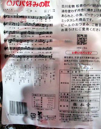 | 古川名物といえば「パパも喜ぶパパ好み」に決まってます。オープニングは「パパ好みの歌」。この頃テレビのコマーシャル見かけなくなりましたね。歌手が手に持っているのは「パパ好み」の袋。歌詞と楽譜が書いてあるんですよ。 | ||