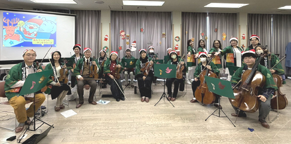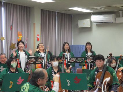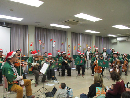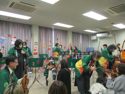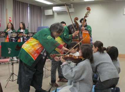 | 「Music Pal」のお時間。とても近くで楽器の音を聞いていただいたり,楽器を弾くのを体験していただいたりしています。 | ||