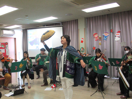 | きょうは仙台童謡愛好家Happy Rbbit」のメンバーが共演してくださいました。ゲッゲロの法被を着tて,コンサートを一緒に盛り上げてくださいました。寒太郎の衣装,ゲッゲロも欲しい。 | ||